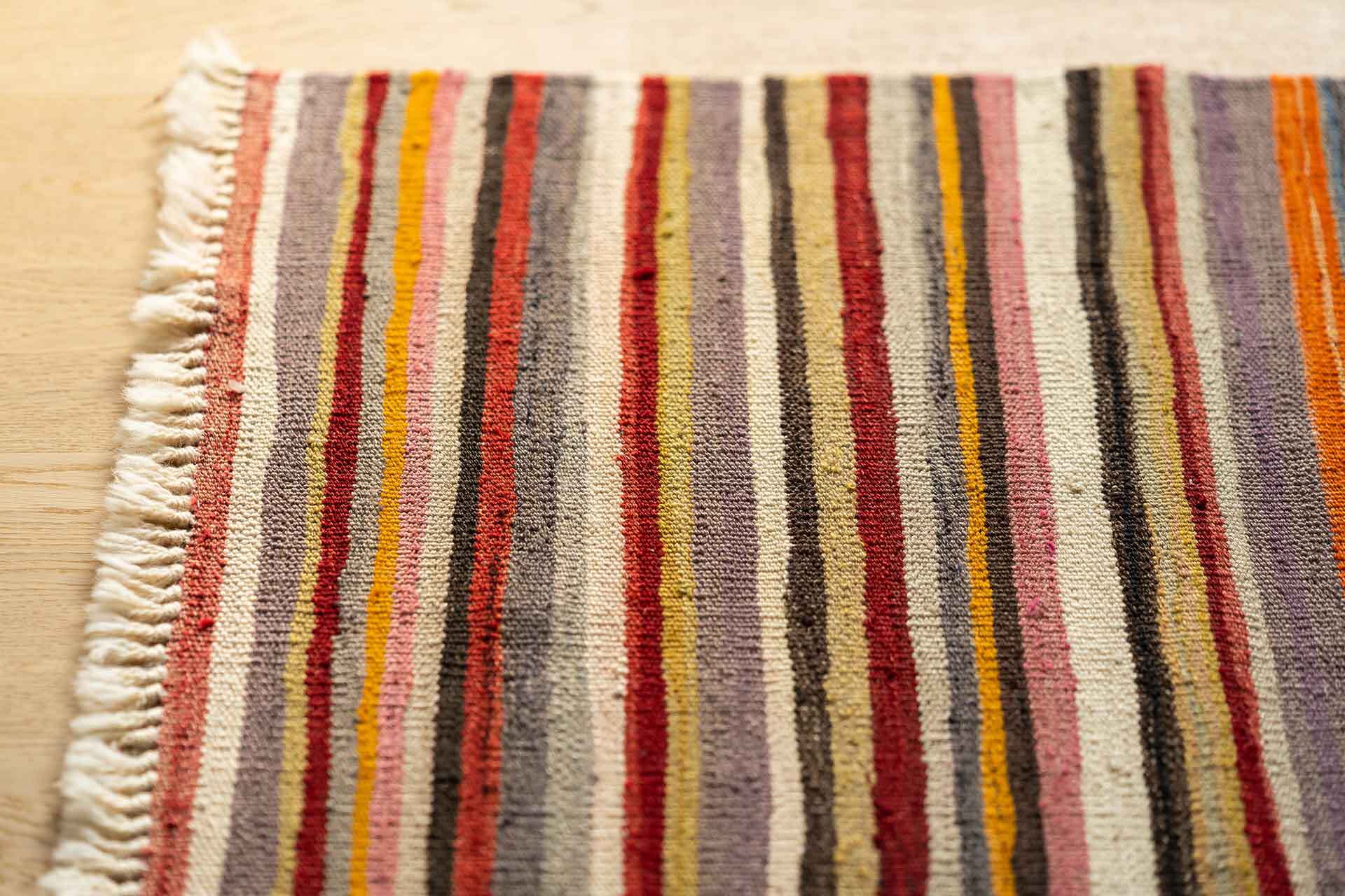 神聖なモスクで礼拝に参加する際、トルコの人々は“サフ”の上に一列に並びます。これは、みんなが平等で誰かが前に出たりすることはないという理由からです。そのサフを抽象的な柄として取り入れたこちらのキリムにも、同じ思いが込められています。同様にサフをモチーフとした「7775」や「8171」のキリムとは異なる多色づかいは、青・赤・黄色といったベースとなる天然染料(茜、インディゴ、ザクロの皮)で染めたウールと無染色(ウール本来が持つ色)のウールから成るものです。ボーダーのピッチや長さが変化するだけで、より現代的な要素を感じさせる一枚に仕上がっています。