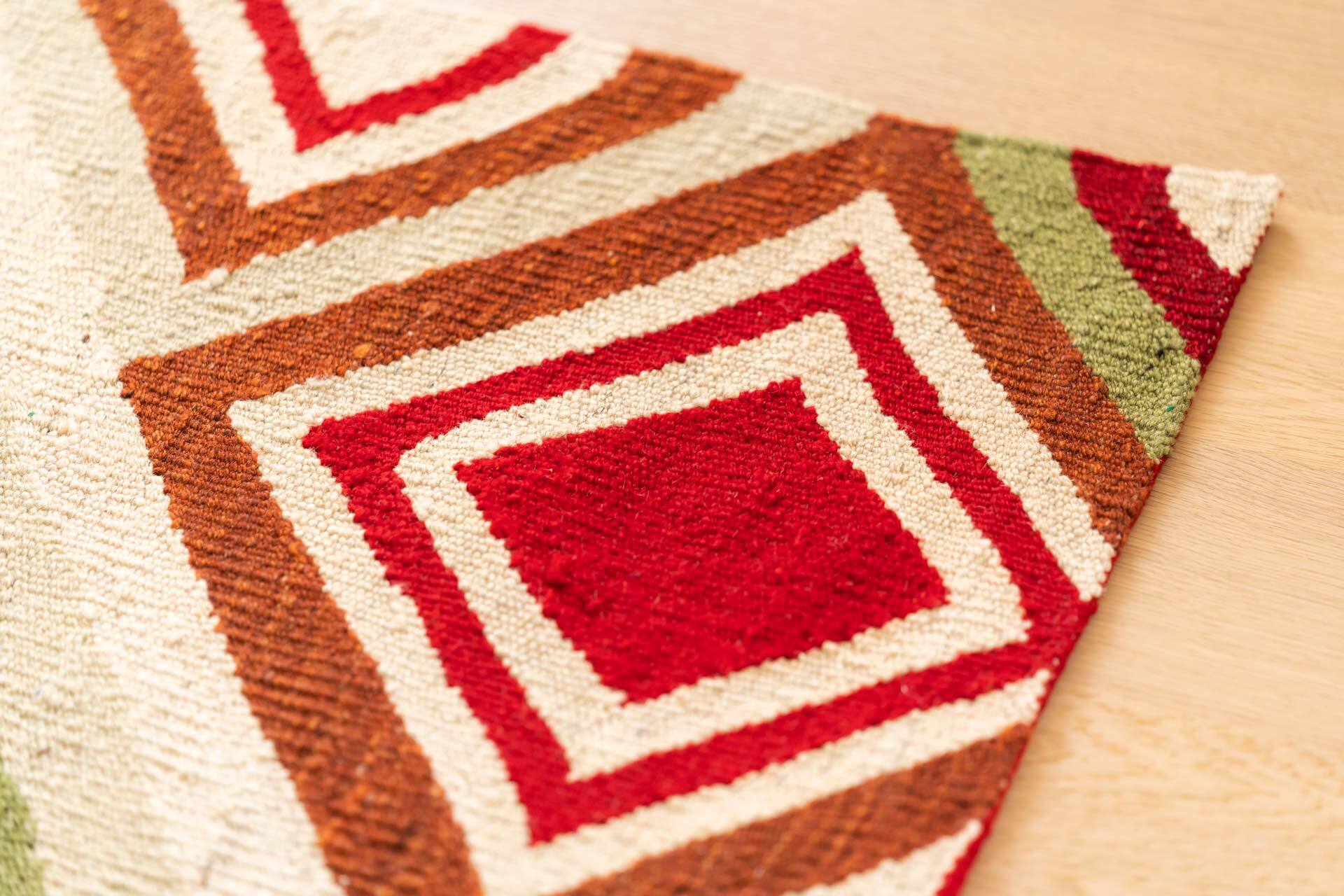 歴史あるキリムに用いられる伝統柄をデザイナーの手でモダンにアレンジし描かれた「dhoku|ドホク」のキリム。ヨーロッパを筆頭に感度の高い人たちに響くデザインのキリムは、日本では未だあまり知られていません。一般的なキリムと比較すると織りに使用される糸をあえて太くし、独特な風合いに仕上げています。大胆な柄・色使いが空間にアクセントを与えます。たくさんのひし形は富の象徴“ダイヤ”を表しており、経済的な豊かさに恵まれますようにと願いが込められる柄です。無染色(ウール本来が持つ色)の白いウールに映える赤や緑、オレンジ色が鮮やかで、見る人に活力を与えます。