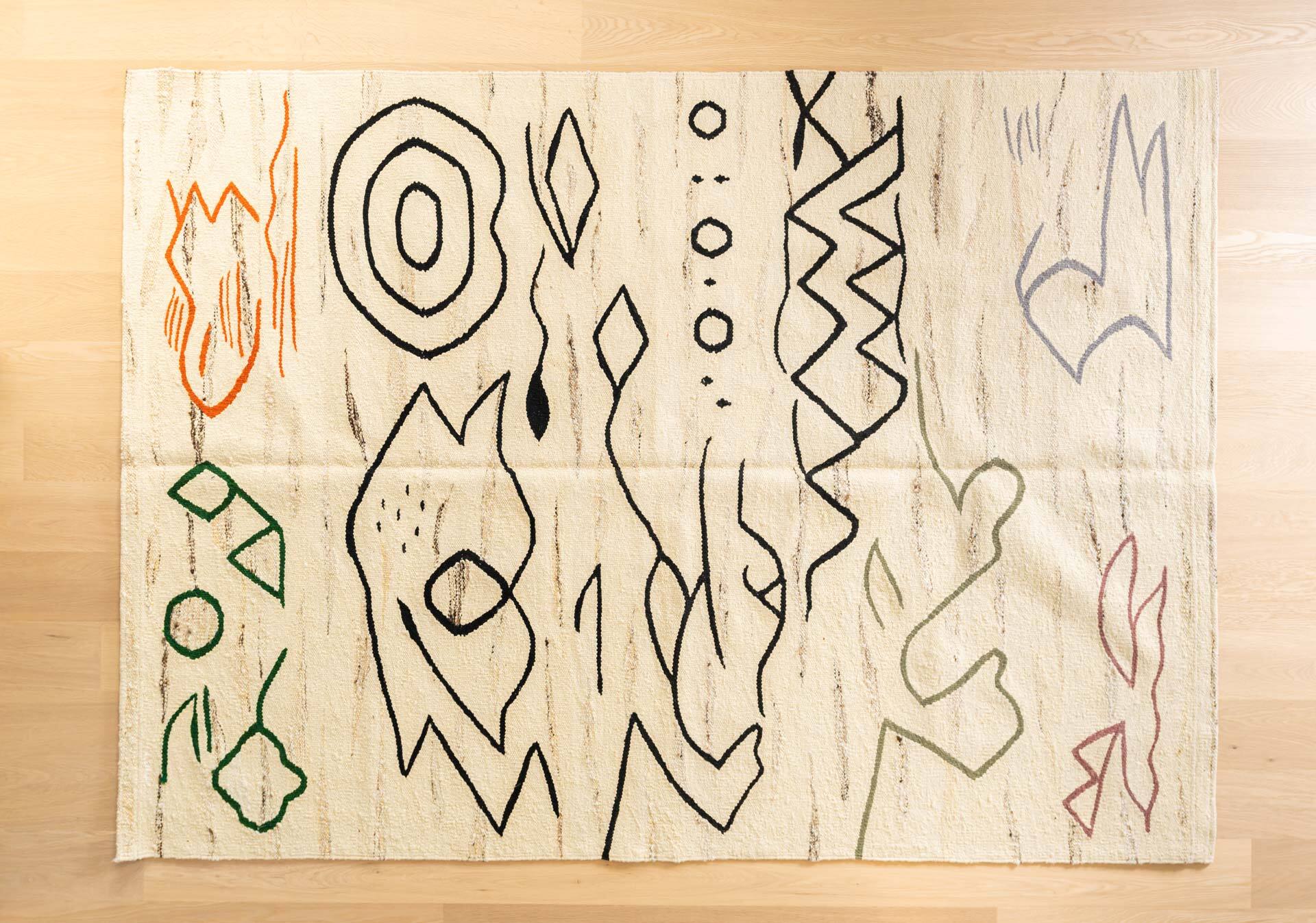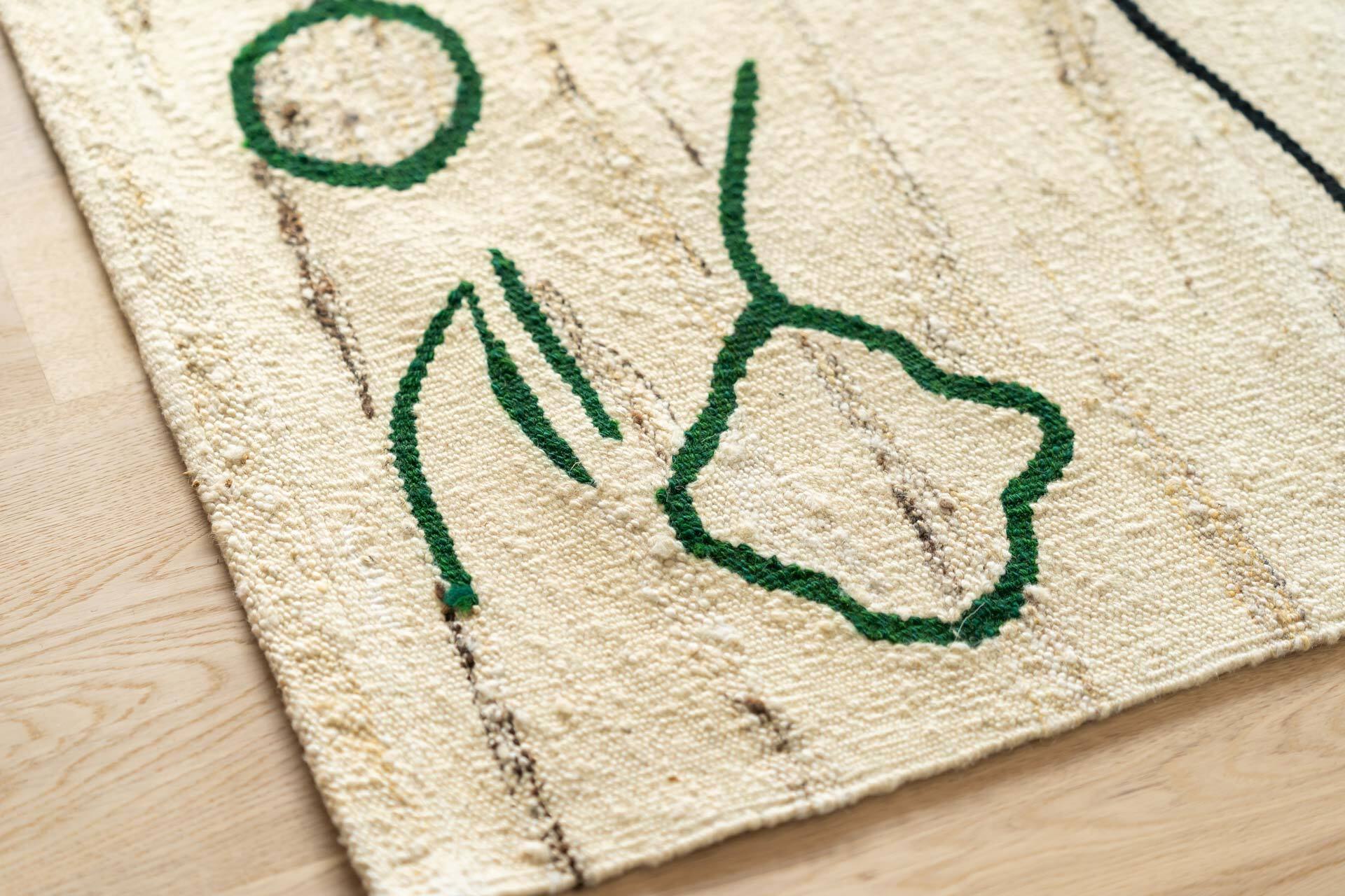 歴史あるキリムに用いられる伝統柄をデザイナーの手でモダンにアレンジし描かれた「dhoku|ドホク」のキリム。ヨーロッパを筆頭に感度の高い人たちに響くデザインのキリムは、日本では未だあまり知られていません。一般的なキリムと比較すると織りに使用される糸をあえて太くし、独特な風合いに仕上げています。大胆な柄・色使いが空間にアクセントを与えます。ちりばめられた不思議な柄のモチーフは、こどもが描いた山の風景や川の流れ、幸せを運ぶ鳥の絵です。着想を得た可愛らしい“イラスト”が、古代壁画のようなキリムとして生まれ変わりました。ベースに無染色(ウール本来が持つ色)の白いウールを使用し、柄がバラつくことなくまとまりのある一枚に仕上がっています。