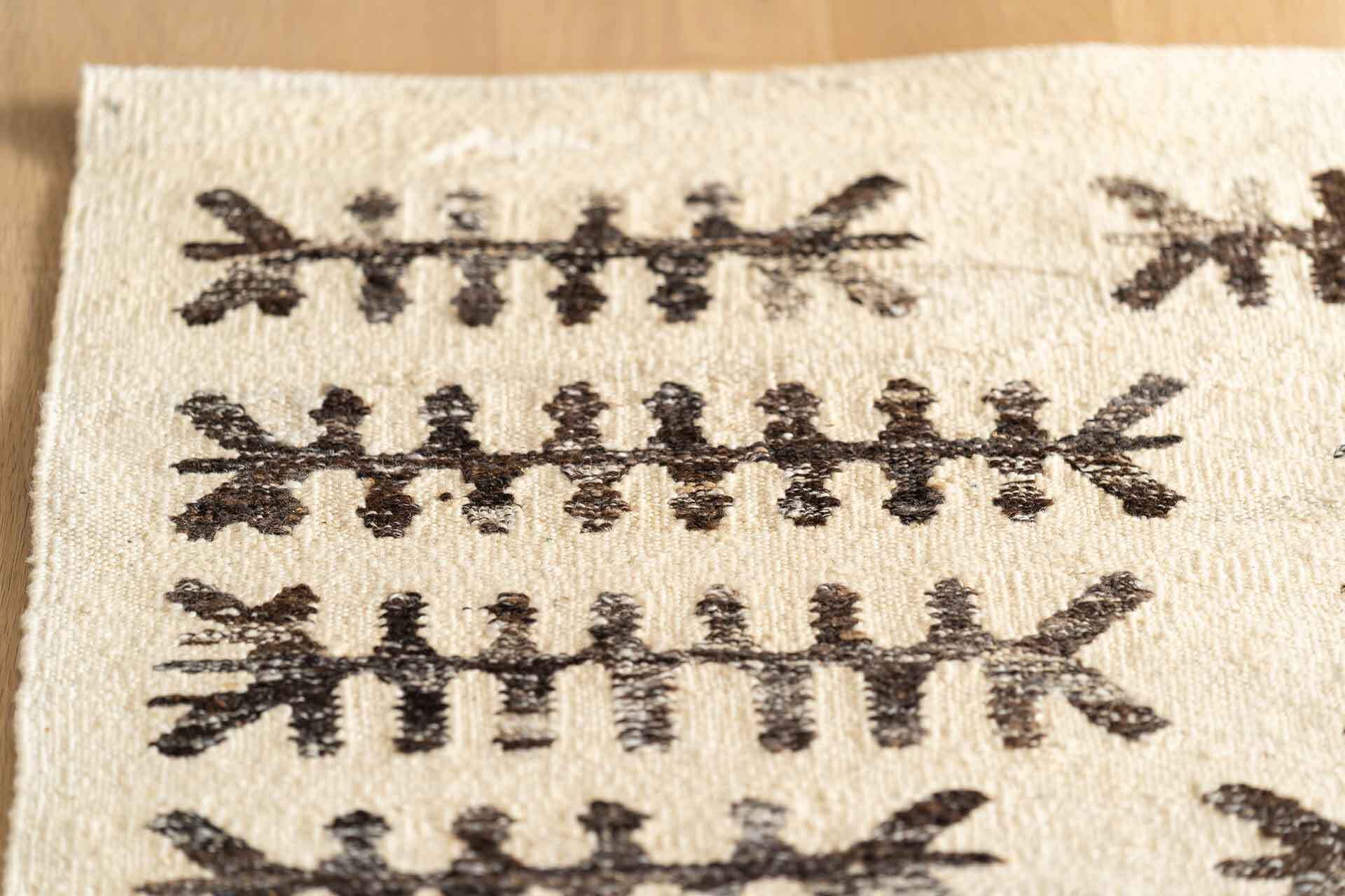 歴史あるキリムに用いられる伝統柄をトルコ人デザイナーの手でモダンにアレンジし描かれた「dhoku|ドホク」のキリム。ヨーロッパを筆頭に感度の高い人たちに響くデザインのキリムは、日本では未だあまり知られていません。一般的なキリムと比較すると織りに使用される糸が太く、カラーリングも独特。大胆な柄・色使いが空間に大きなインパクトを与えます。こちらは一見魚の骨にも見える柄が並ぶモダンアートのようですが、実は550年以上の歴史ある中東最大級の屋内市場“グランドバザール”の地図を表しておりトルコらしさが全面に出た一枚。柄が共通する70160202とは対照的にナチュラルな色合い。白でも原毛は汚れをよりはじくので、水洗いで容易なお手入れも魅力の一つです。