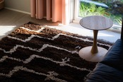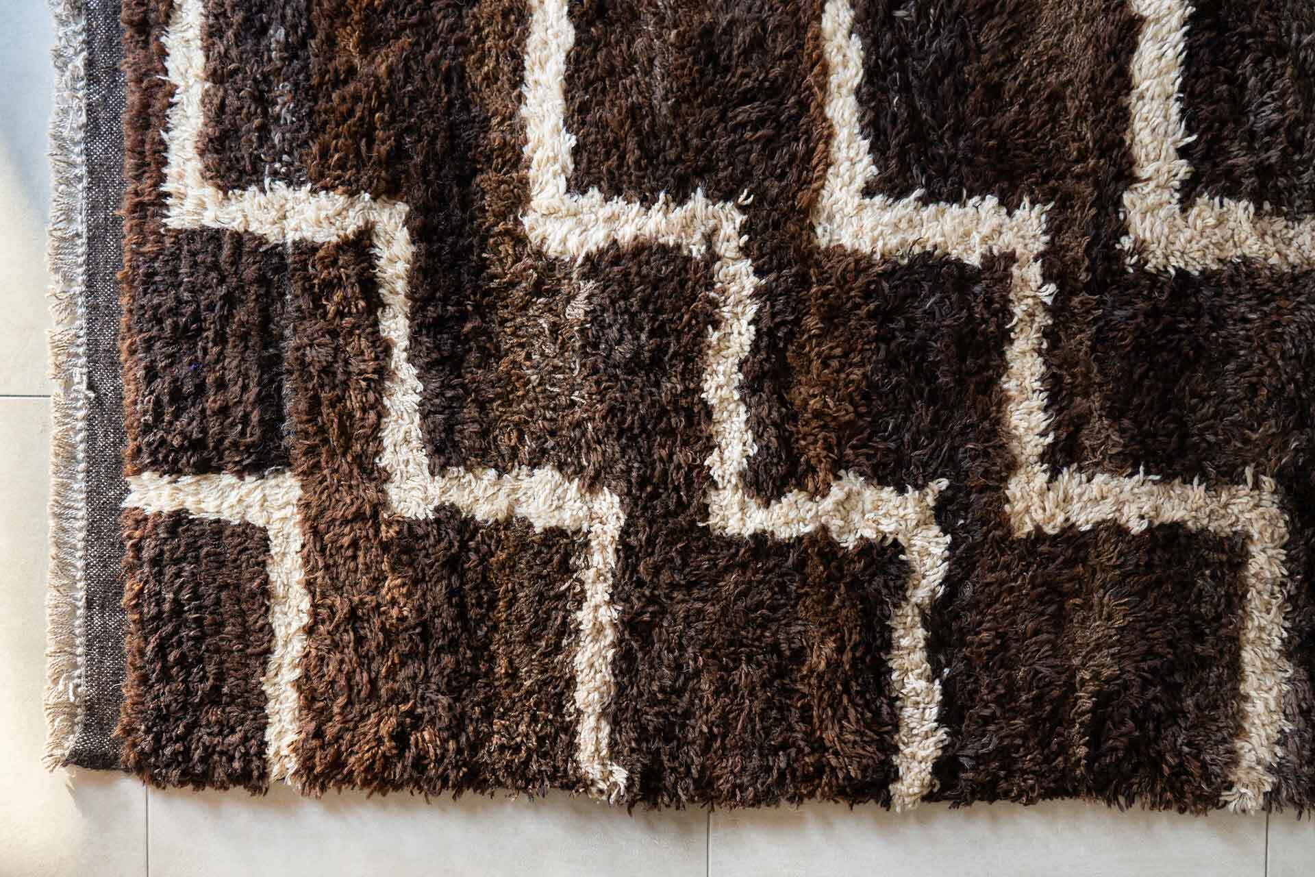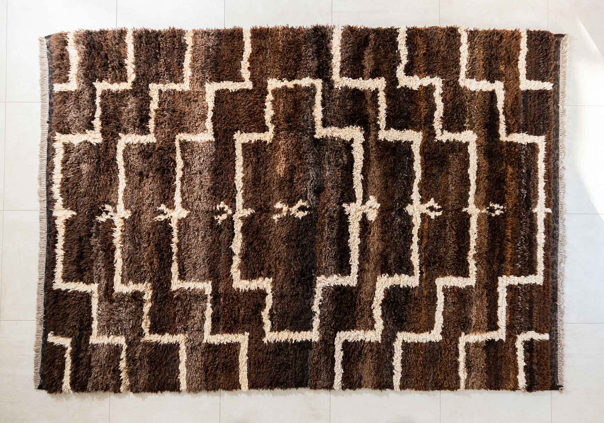 ラグの柄は、“生命の樹”を表しています。一般的には根っこから木の頂上までを描くことで、生まれてから無事に天国へと向かうことができるようにという願いが込められる柄ですが、こちらのラグには根っこの部分が描かれていません。ラグの中心から葉先へと延々に繰り返す柄は、その命が永遠に続きますようにという願いが込められています。ウールは無染色(ウール本来が持つ色)で黒や白、茶色など、さまざまな羊とヤギのウールを混毛しています。毛足が長いツルの中でもこちらは特に毛足が長く密度が高い織りで、直にお座りいただいても格別の座り心地です。冬季に温かいのはもちろん、夏季でもエアコンの冷気が隙間に入り込み驚くほどヒンヤリ快適です。また、日本のリビングサイズに合ったこのようなサイズのツルは現地でも大変希少です。